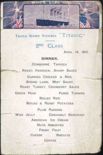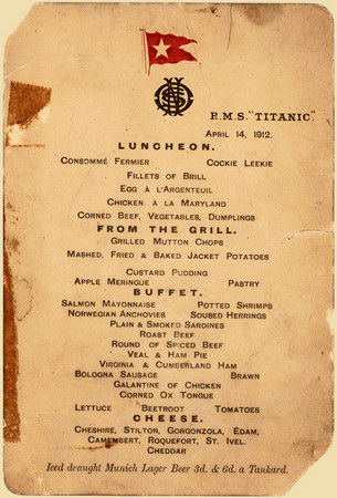 三等舱的菜单明显与其他舱等十分悬殊,事实上当天沉船时,头等舱和二等舱的乘客都有使用救生船的优先权,因此泰坦尼克号多达1500位罹难者,其中大部分便是来自三等舱、没有获救机会的乘客。