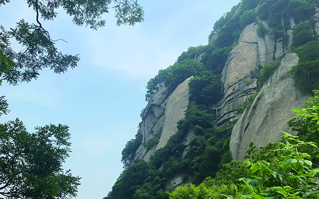 一点一点的我们开始看到了一个又一个的山顶,也看到了华山那独特的石质,真白!